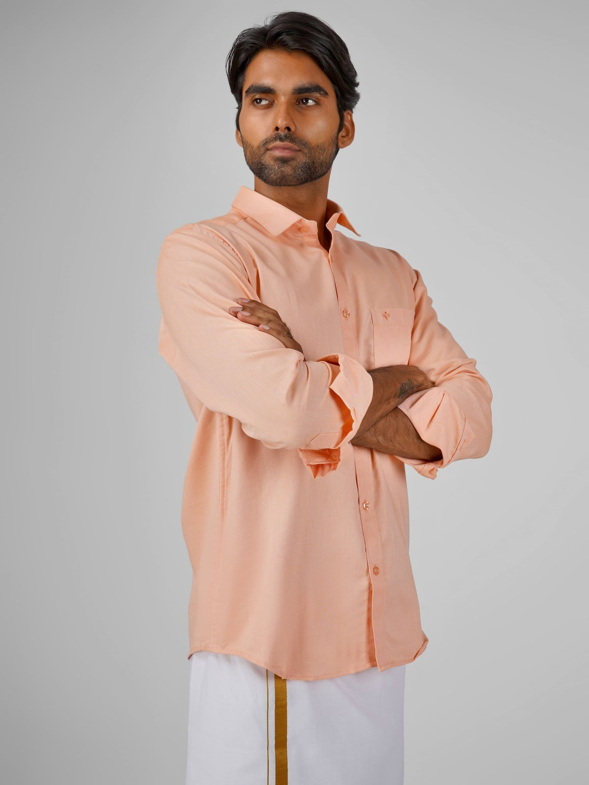 The Muskmelon Oxford Cotton Shirt from Azhagan Shirts brings a soft touch of color to your traditional wardrobe. Woven from premium Oxford cotton, this shirt balances breathability with structure, while its gentle peach hue adds subtle sophistication to any sacred or festive setting.